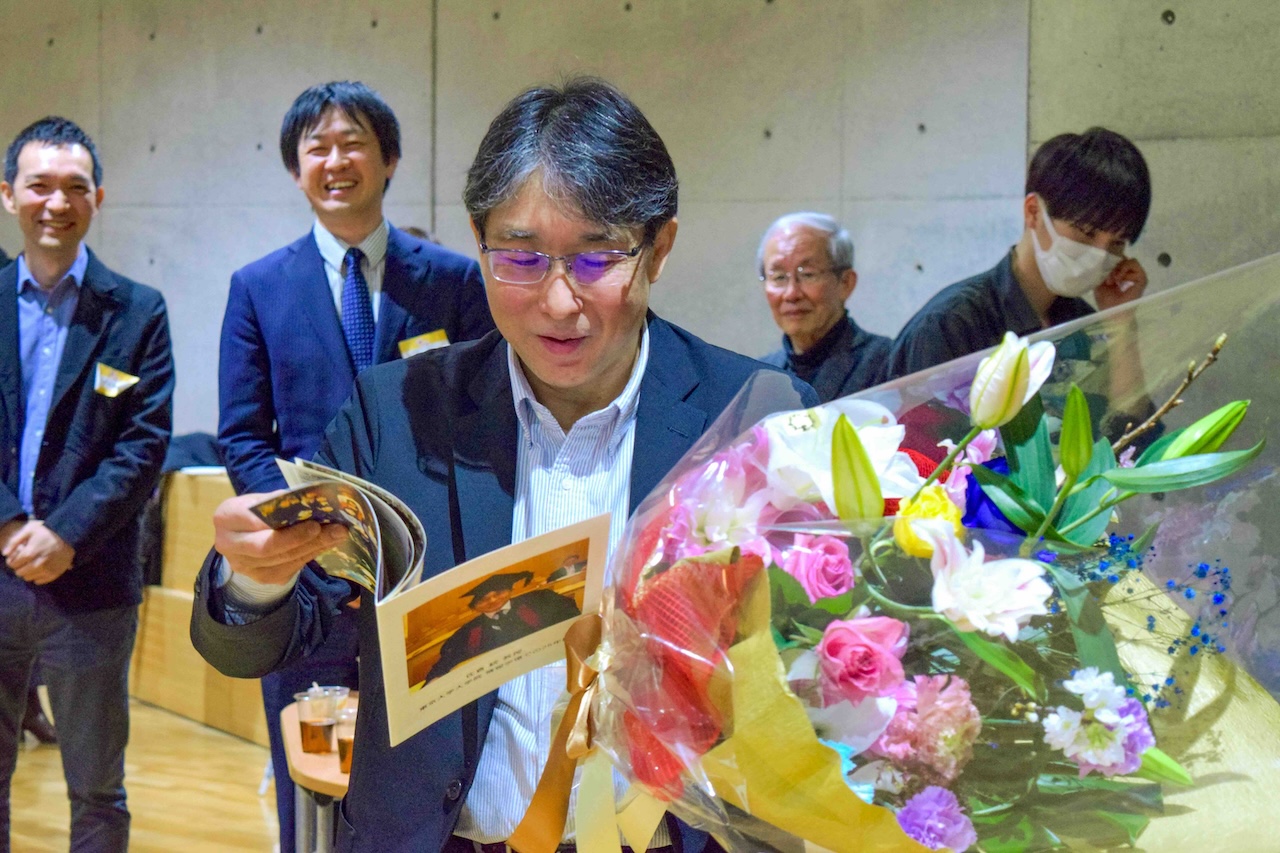 懇親会では研究室有志によるフォト&メッセージブックと花束の贈呈があり、参加者には記念品としてイラスト入りクッキーが配られました。